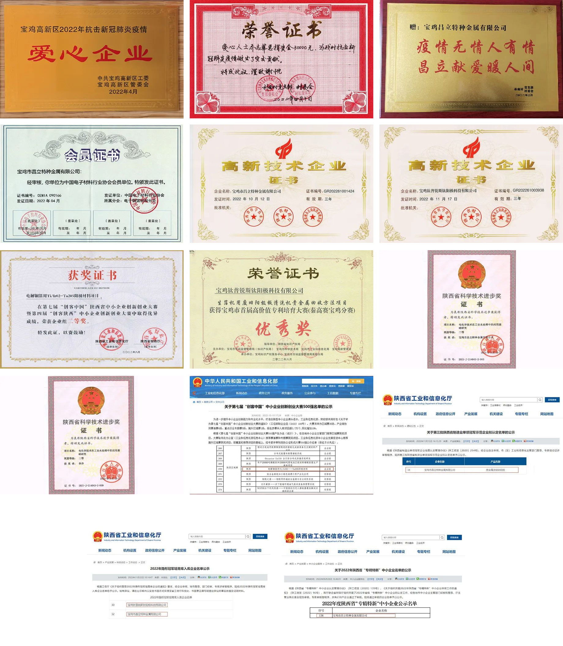 歲月不居,天道酬勤?;仡?022年,公司創(chuàng)造了可喜可賀的成績(jī)。在疫情期間承擔(dān)社會(huì)責(zé)任,助力一線抗疫。昌立公司被認(rèn)定為陜西省“專精特新”中小企業(yè);《電化學(xué)技術(shù)在工業(yè)水處理中的應(yīng)用基礎(chǔ)研究》項(xiàng)目獲“省科學(xué)技術(shù)進(jìn)步獎(jiǎng)”二等獎(jiǎng);入選第三批陜西省制造業(yè)單項(xiàng)冠軍示范企業(yè);入選2022年陜西隱形冠軍培育庫(kù)。鈦普銳斯被認(rèn)定為“國(guó)家高新技術(shù)企業(yè)”;2022年陜西省秦創(chuàng)原高價(jià)值專利大賽分賽區(qū)-“寶雞高價(jià)值專利培育大賽優(yōu)秀獎(jiǎng)”;第四屆“創(chuàng)客陜西”中小企業(yè)創(chuàng)新創(chuàng)業(yè)大賽省級(jí)決賽獲大賽企業(yè)組二等獎(jiǎng);入圍第七屆“創(chuàng)客中國(guó)”中小企業(yè)創(chuàng)新創(chuàng)業(yè)大賽500強(qiáng);入選2022年陜西隱形冠軍培育庫(kù)。